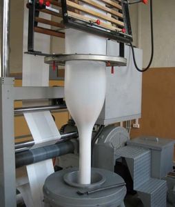 Из экструдера сырье подается под давлением в формующее устройство. После выхода из него, полимер раздувается до необходимых размеров, с последующим охлаждением пленки. Далее пленка проходит через стабилизирующий узел.